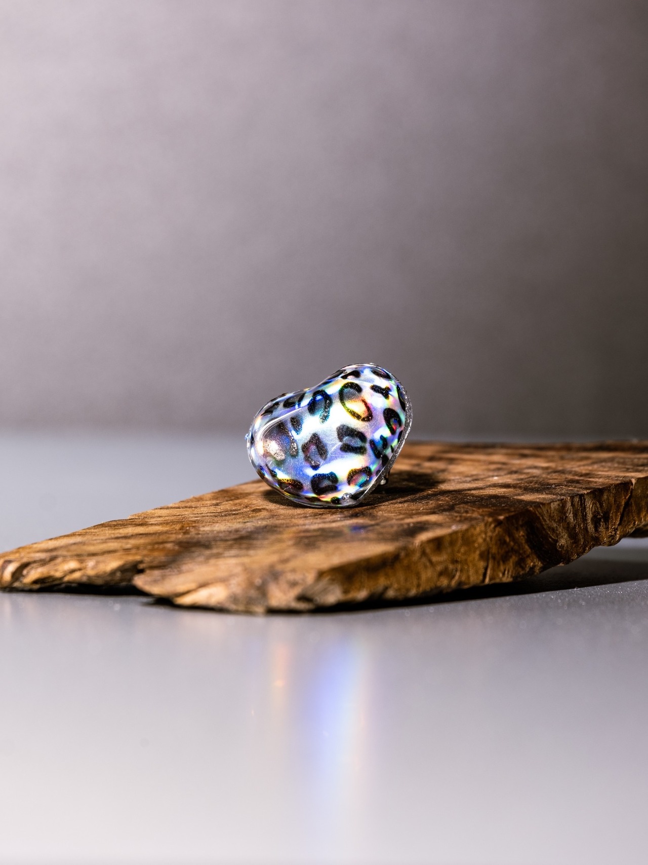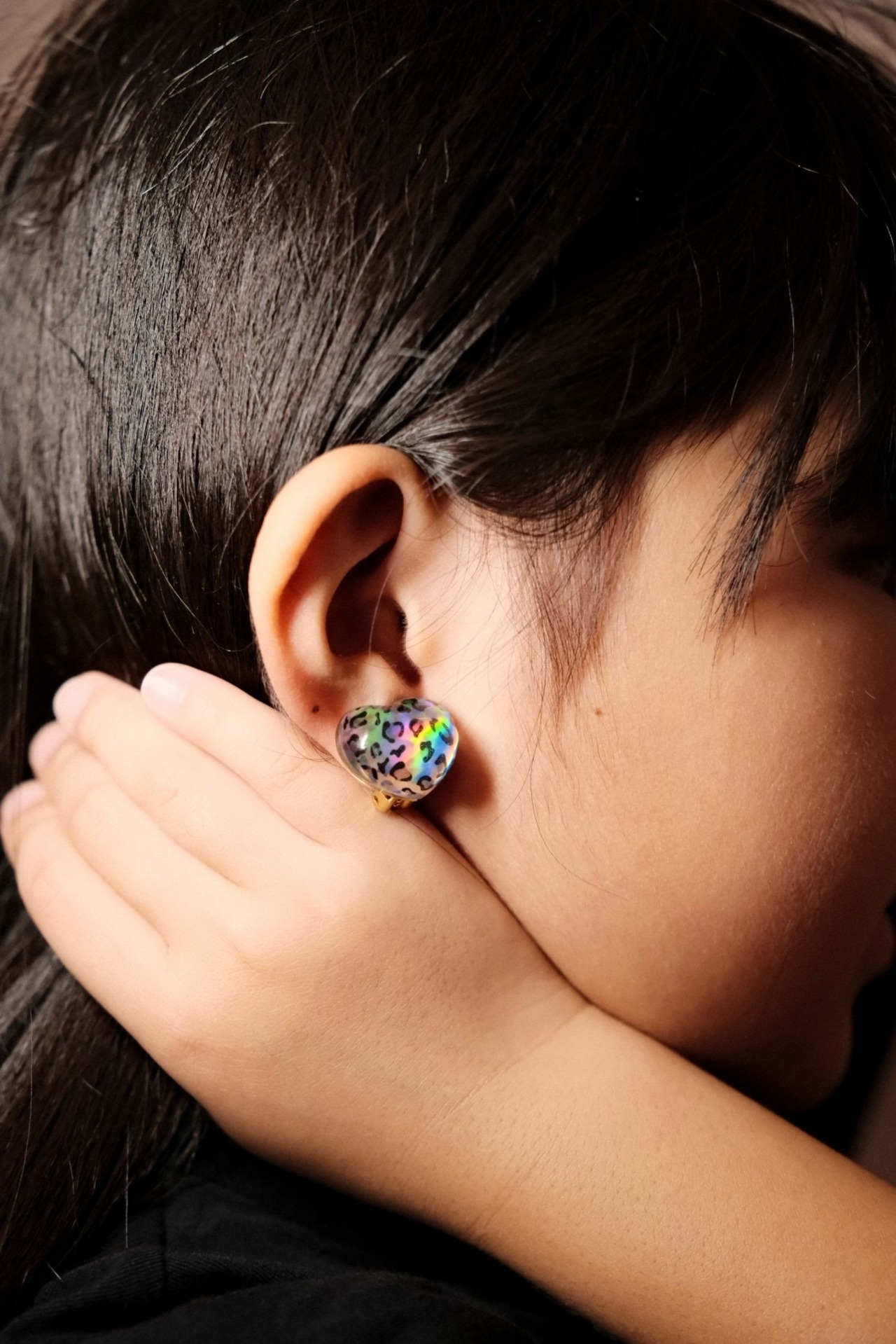 It's a heart-shaped stud earring with a leopard pattern and laser beam film ^ ^