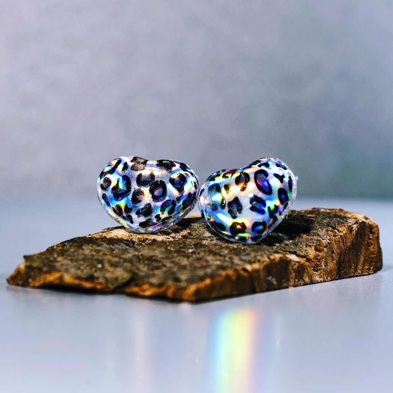 レオパード柄にレーザービームフィルムを合わせたハート型のスタッドピアスです^ ^